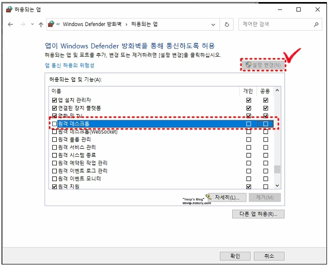 [설정변경] 선택 후 원격 데스크톱 체크 해제