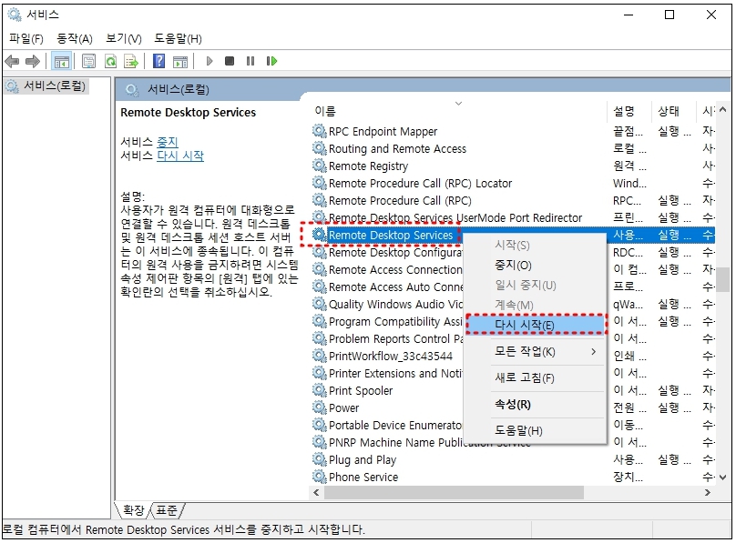 5. services.msc 에서 Remote Desktop Services [다시시작]