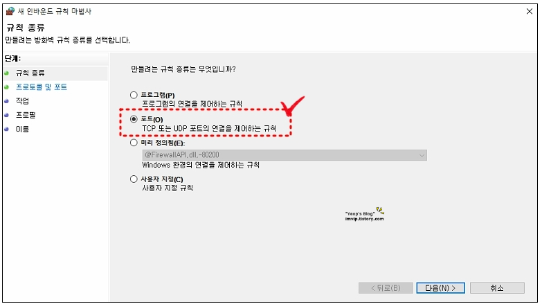 2. [포트] 선택 > [특정 로컬 포트]에 변경할 포트 (13389) 입력 후 [다음] 버튼 클릭