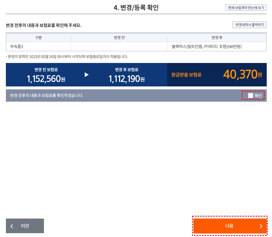 변경 전 보험료와 변경전 보험료 확인 후 [확인] 체크 후 [다음]