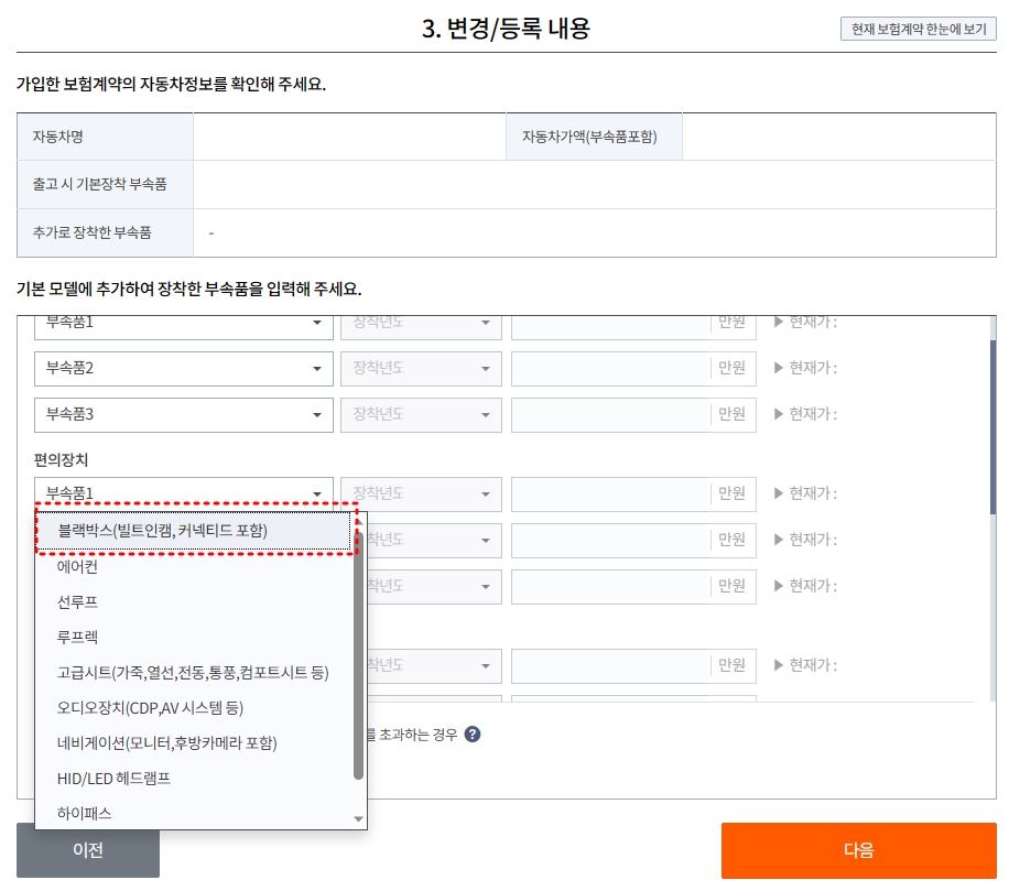 4. 변경/등록 내용에서 편의장치 > 블랙박스(빌트인캠, 커넥티드 포함) 선택