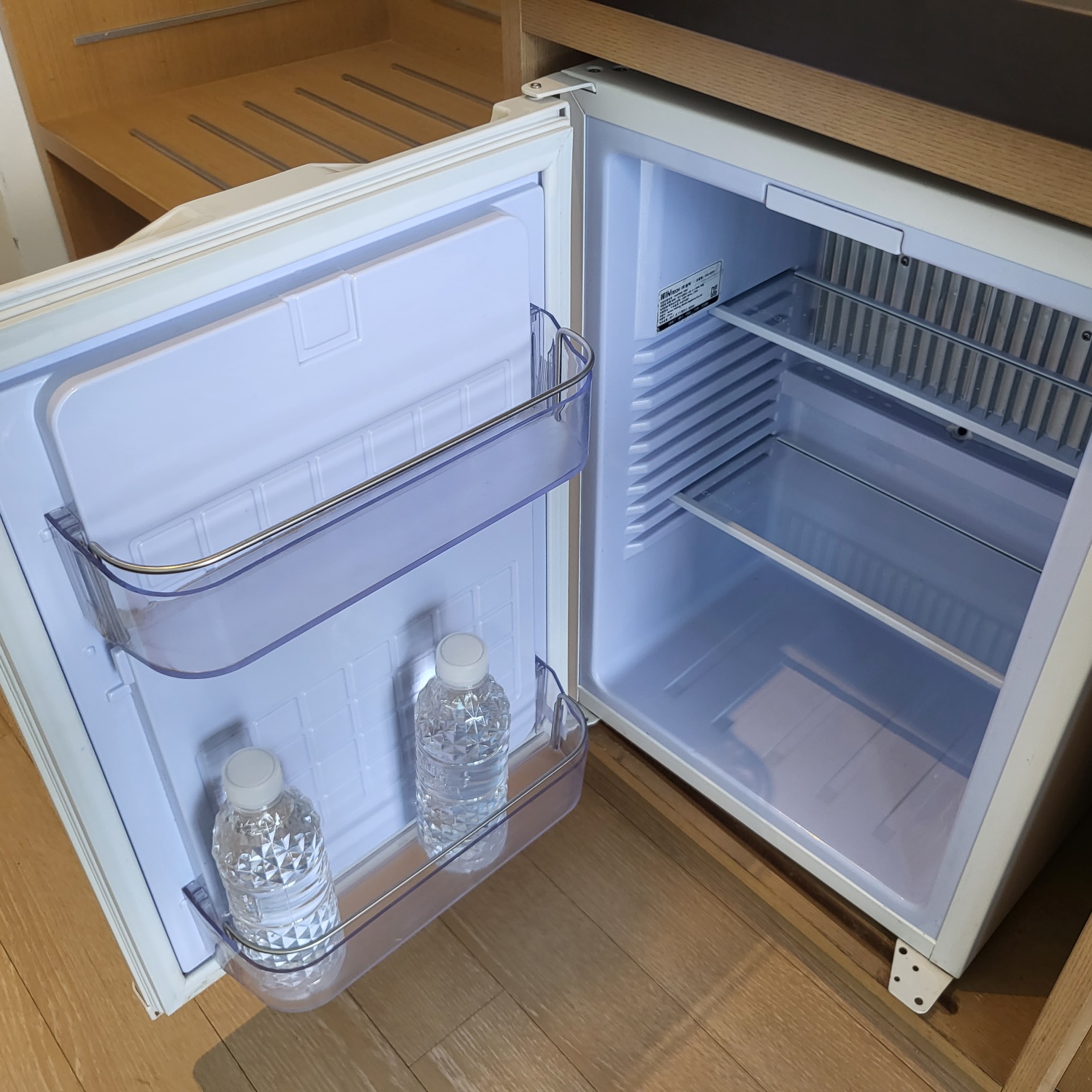 다리미, 금고, 냉장고에 생수 2병, 커피포트, 와인잔, 머그컵