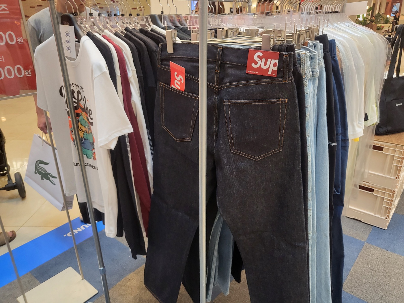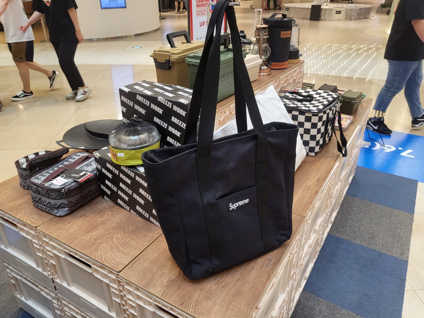 하이그라운드 여름 캠핑마켓으로 미국에서 직수입한 슈프림 상품들이 전시되어 있습니다.