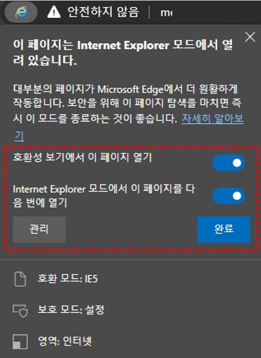 2. 호환성 보기에서 이 페이지 열기 활성화 후 완료