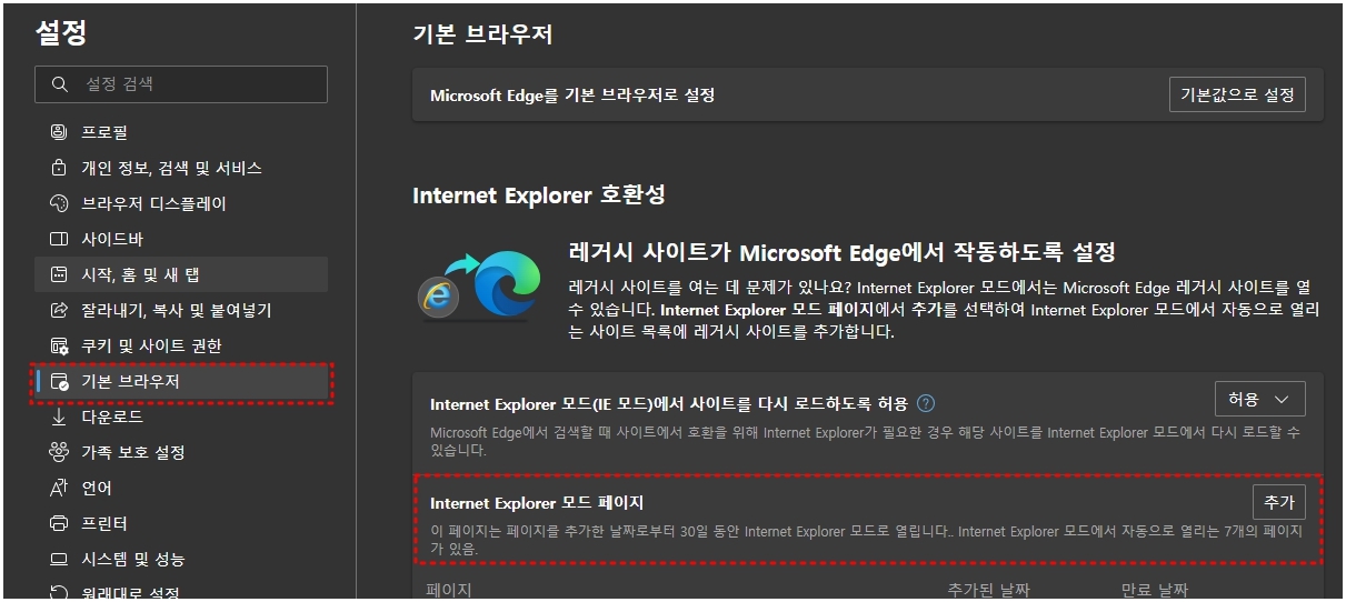2. 기본브라우즈 > Internet Explorer 모드 페이지에서 [추가] 버튼 클릭