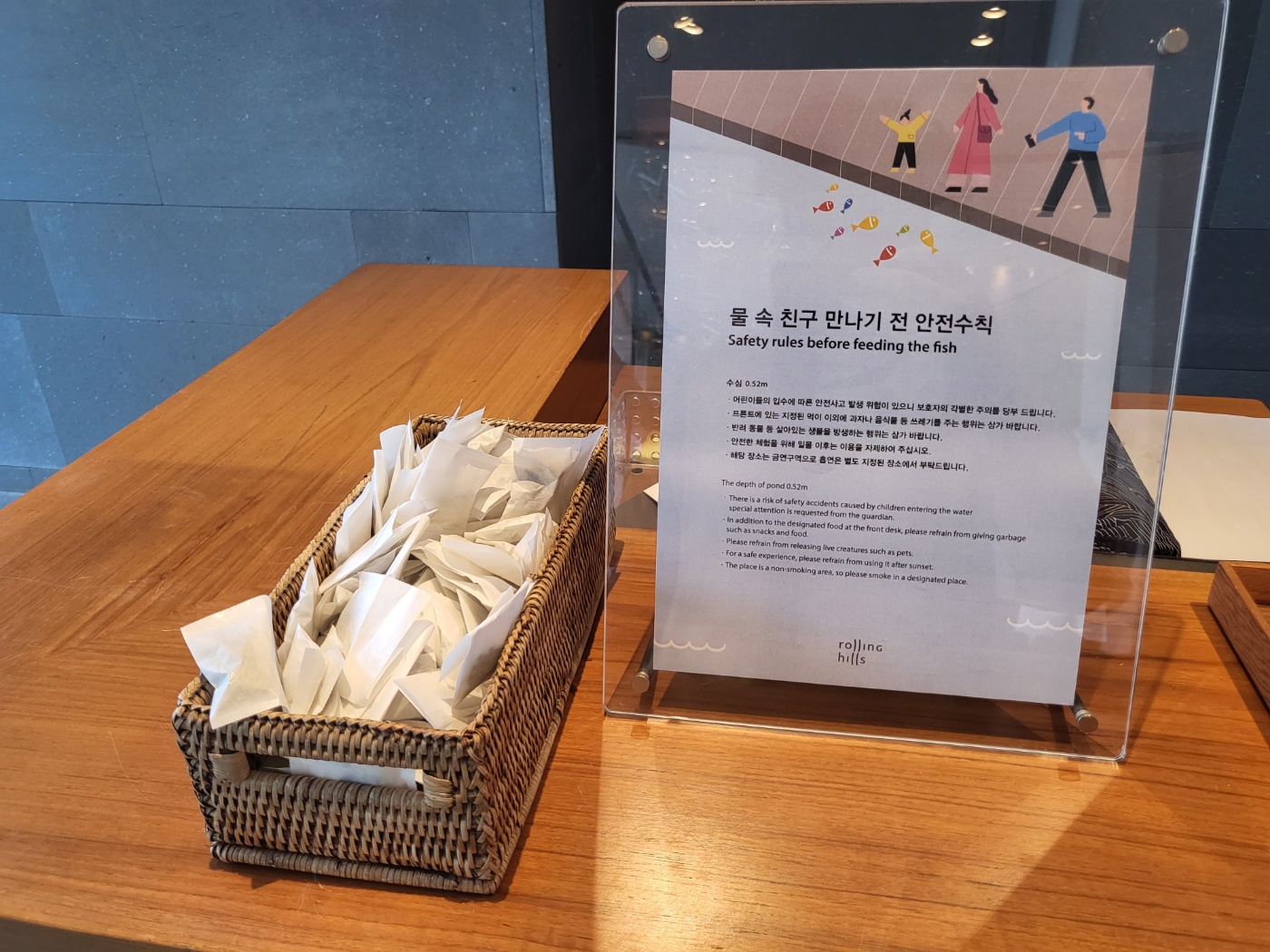호텔 로비 카운트 쪽에 물고기 먹이가 비치되어 있어 누구나 무료로 이용이 가능합니다.