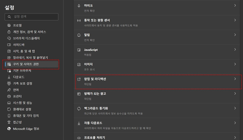 또는 사용할 수 없음 선택 후 [팝업 전송 및 리디렉션 사용이 허용됨]에서 사이트 주소 추가