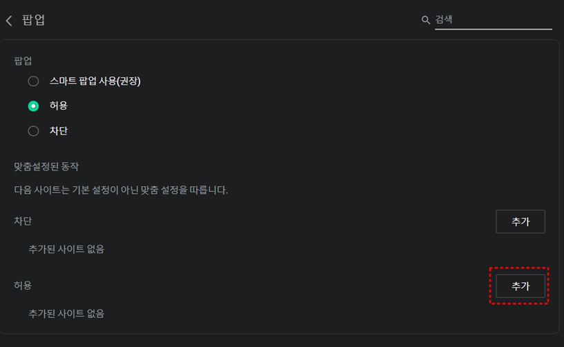 4. [팝업] 허용 또는 허용 [추가] 버튼 눌러 사이트 추가