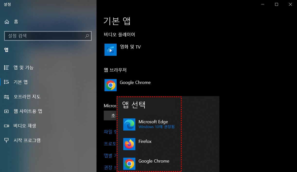 4. 웹 브라우저 항목에서 기본 브라우저 설정 하시면 됩니다.