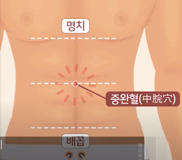 지압법: 허리를 곧게 편 상태에서 심호흡을 하며 배꼽 약간 위, 중완혈 지점을 눌러줍니다.