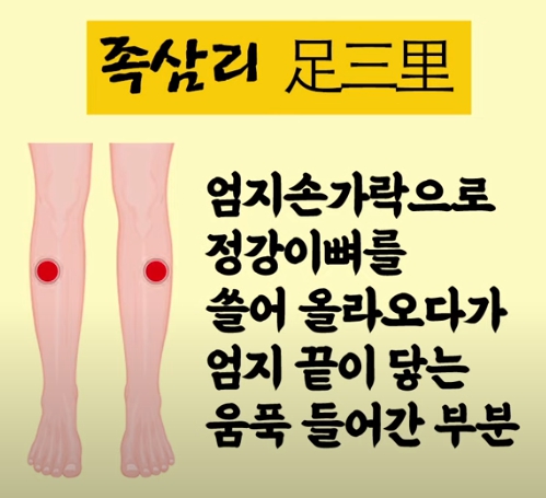 지압법: 족삼리혈 5초 눌렀다 뗴기 반복