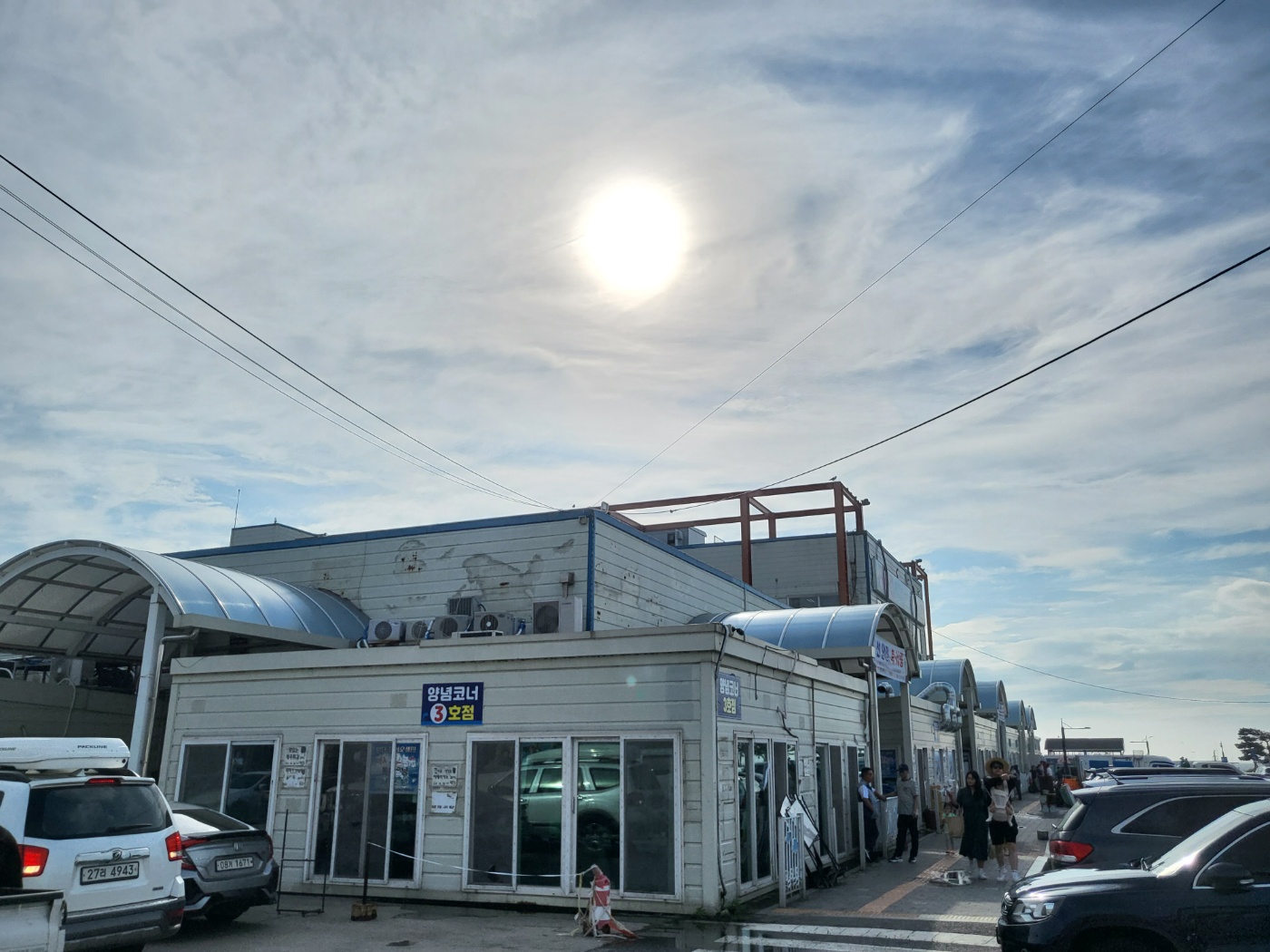낙조길 들어서는 길 왼편으로는 음식점들로 가득했고 오른쪽은 수산물직판장과 큰 주차장이 잇었습니다.