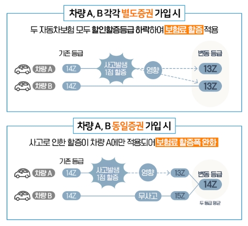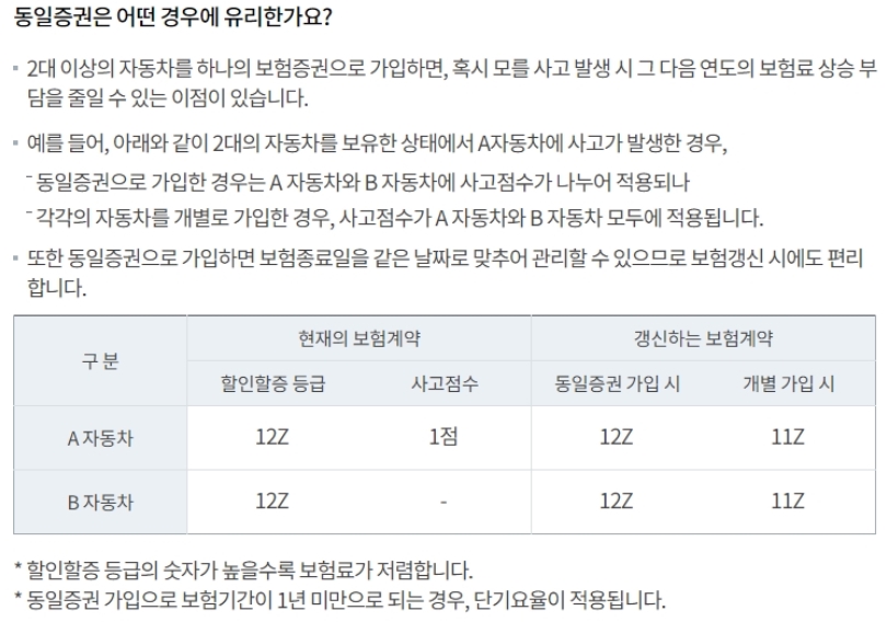 동일증권이란 같은 사람이 두대 이상의 차를 갖고 있는 경우 여러 증권을 하나로 묶어서 계약을 체결하는 것