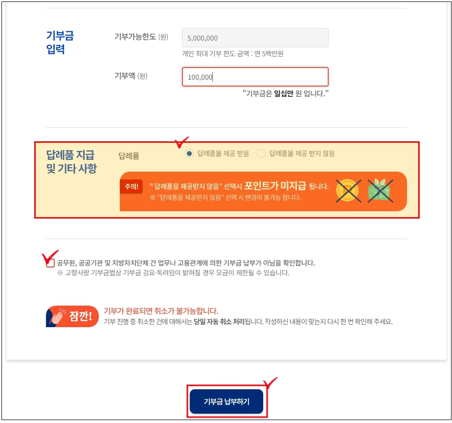- 기부금 사용 분야: 해당 지자체의 주민 복리 증진 사업 등에 사용
