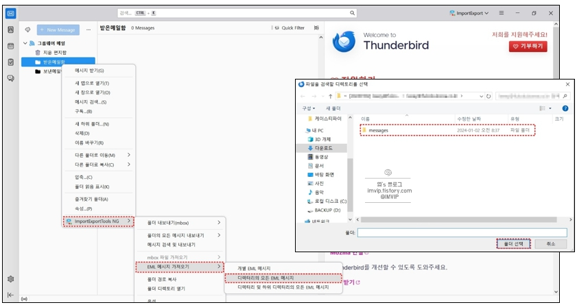 아까 추가했던 부가기능 ImportExportTools NG > EML 메시지 가져오기 > 디렉토리의 모든 EML 메시지
