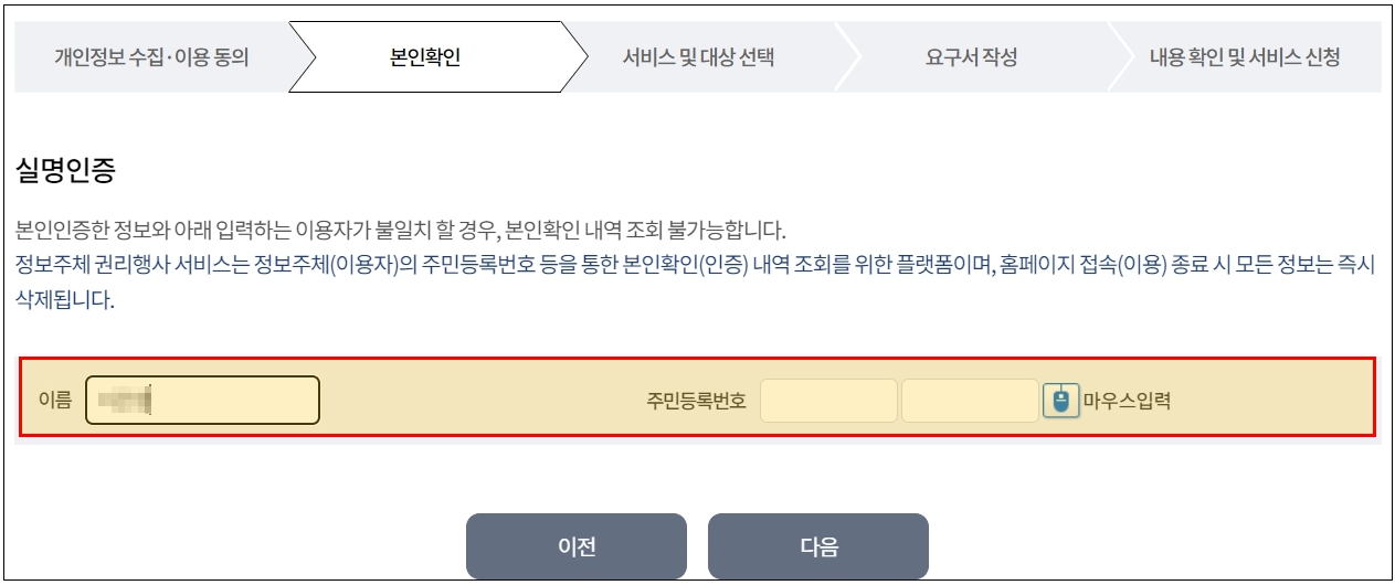 4. 본인확인 이름, 주민등록번호 입력 후 다음