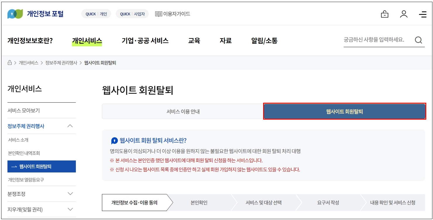2. 개인서비스 > 본인확인 내역조회 > 웹사이트 회원탈퇴