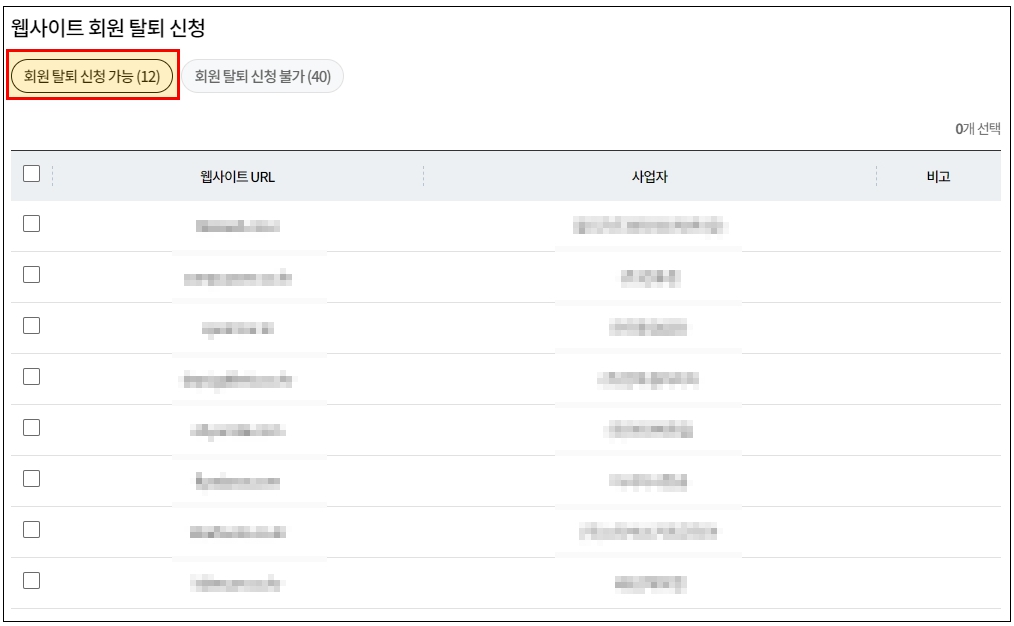 회원탈퇴 신청 가능 / 회원탈퇴 신청 불가로 나뉘게 됩니다.