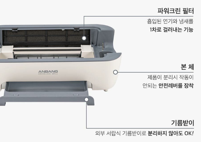 - 집에서 고기를 구워 먹게 되면 기름이 공기 중으로 날아다녀 바닥이 미끄러워지고 집안이 온통 고기냄새가 배는데 안방그릴을 사용하게 되면 이 점이 해결돼서 가장 큰 장점이 아닐까 싶습니다.