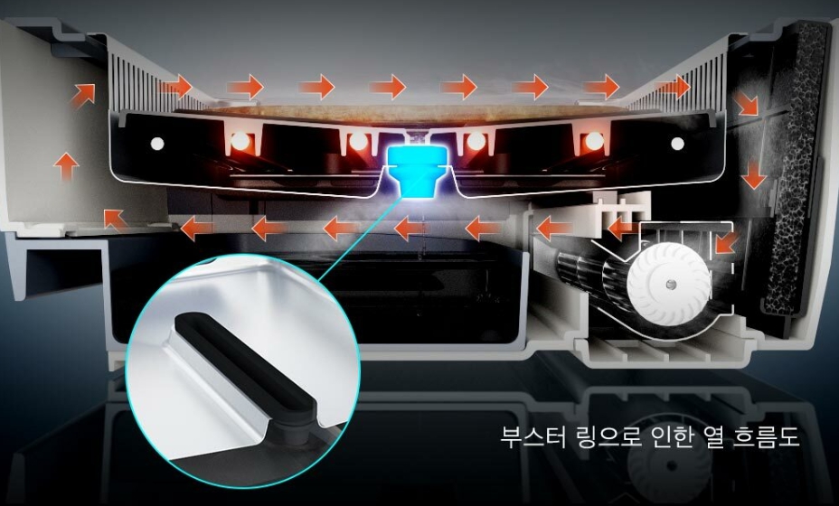 기름 유도판에 장착되어 있는 부스터 링이 공기의 흐름을 바꿔 열손실을 최소화시켜줍니다.