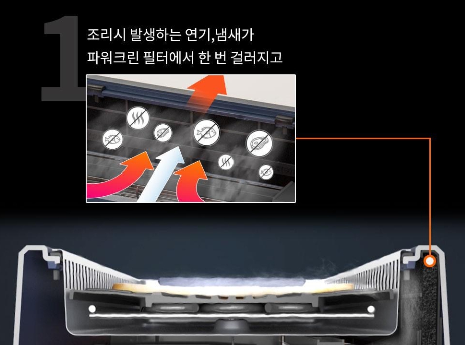 연기 흡입구에 흡입된 연기와 냄새가 파워크린 필터에서 한번 걸러진 후에 파워팬을 통해 다시 한번 걸러집니다.