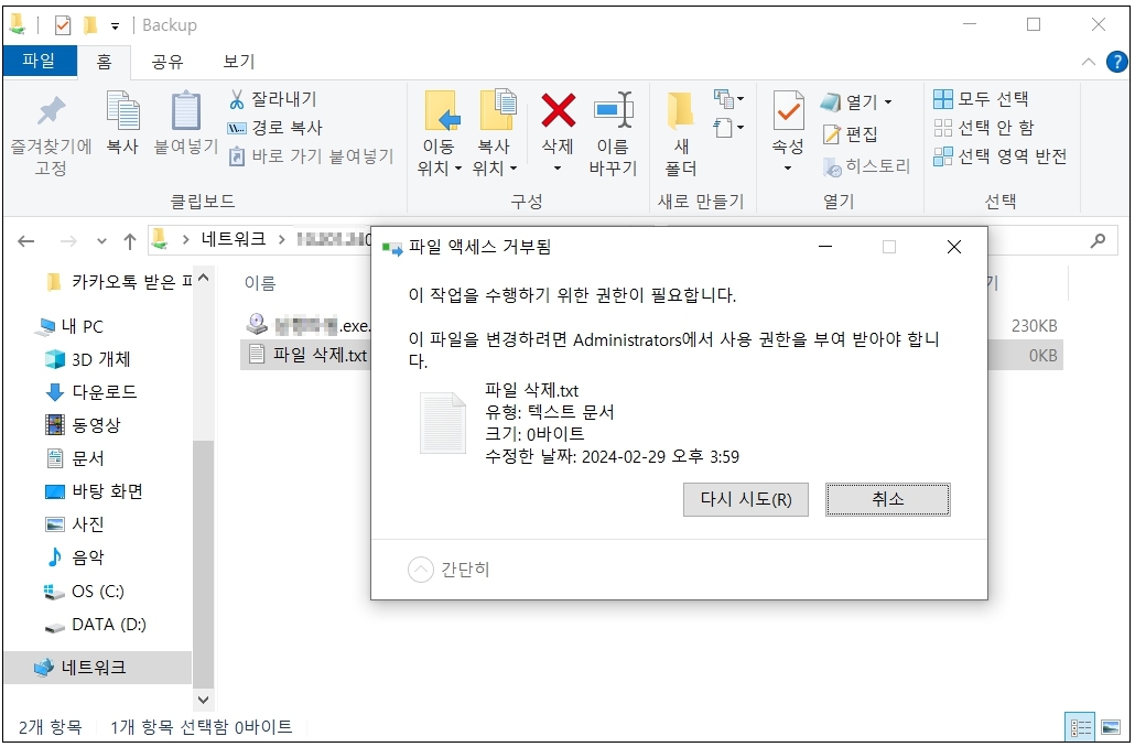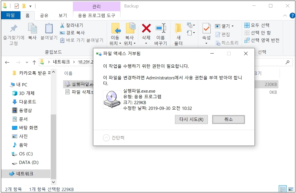 2. 파일 삭제 및 실행파일 실행하면 아래와 같이 액세스 거부가 뜹니다.