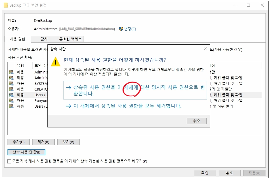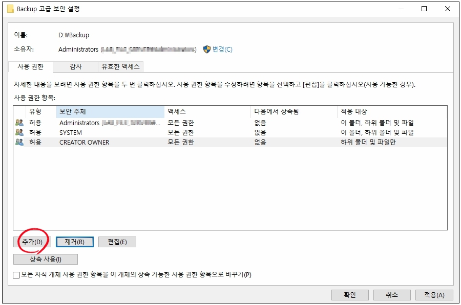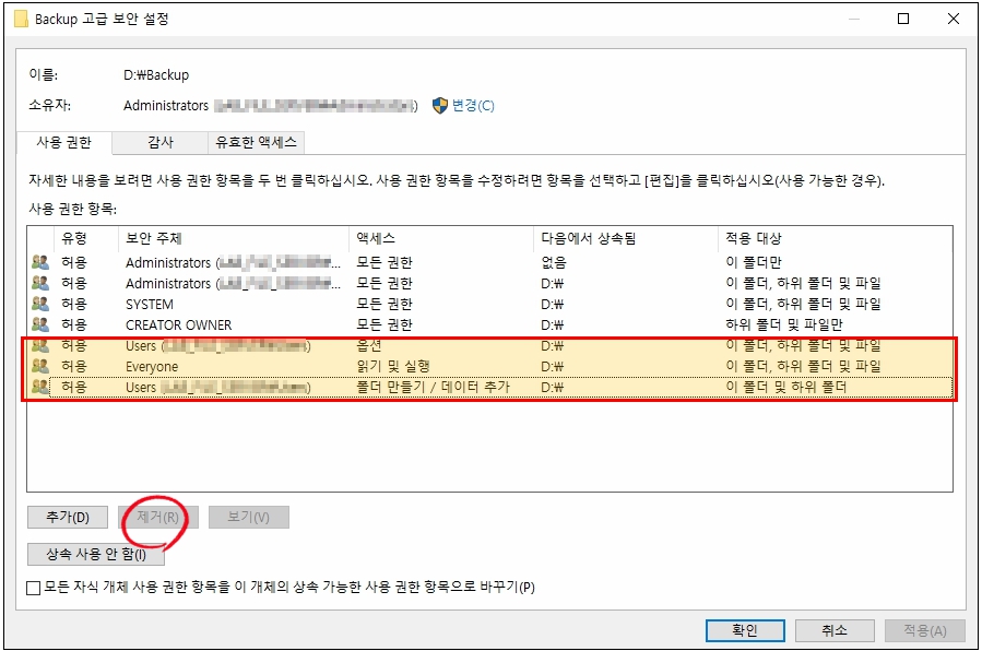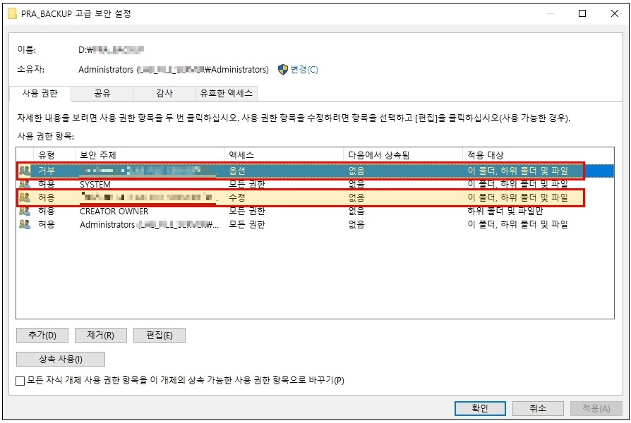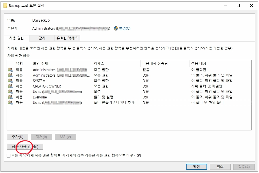파일이나 폴더에 자체적으로 권한을 설정하기 위해서는 권한을 상속받으면 안됩니다.