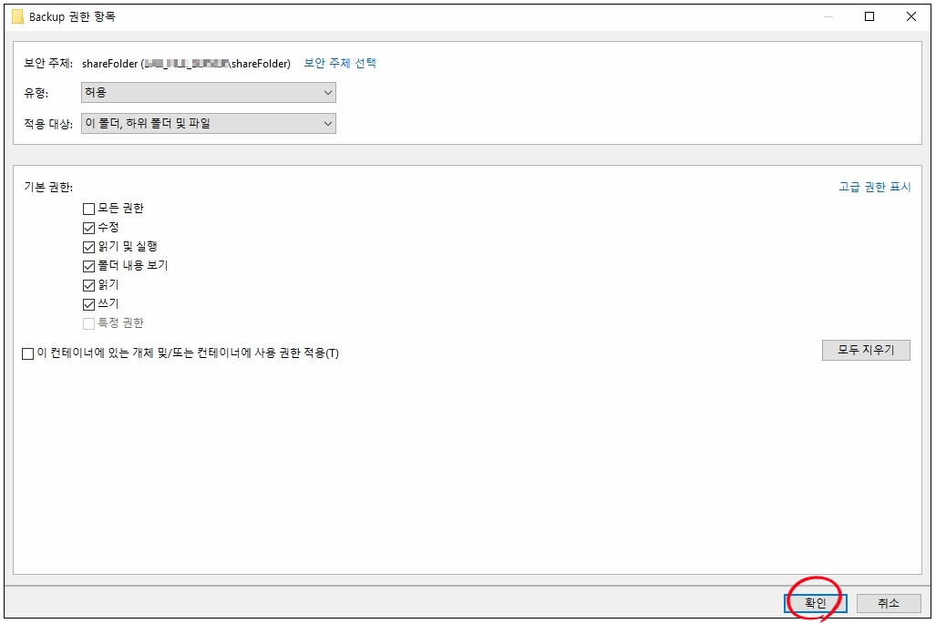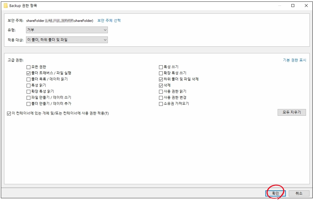 이 컨테이너에 있는 개체 및 /또는 컨테이너에 사용 권한 적용 체크 해제시 : 적용한 폴더 하위 폴더도 적용