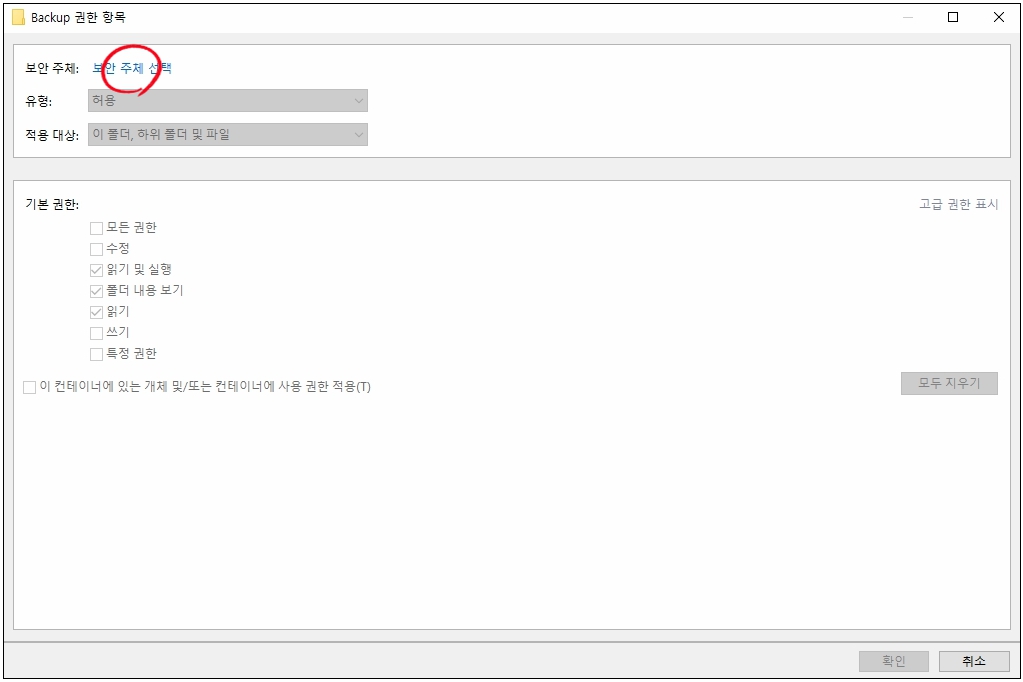 거부 유형의 기본권한에 > 모두지우기 > 고급권한 표시 체크 후에 확인