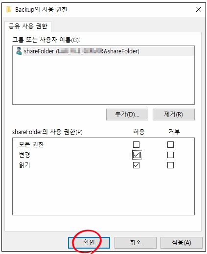 허용 유형의 기본 권한에 수정을 체크 (쓰기는 자동 체크)후 확인