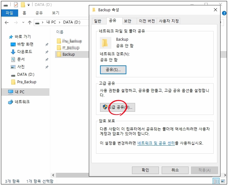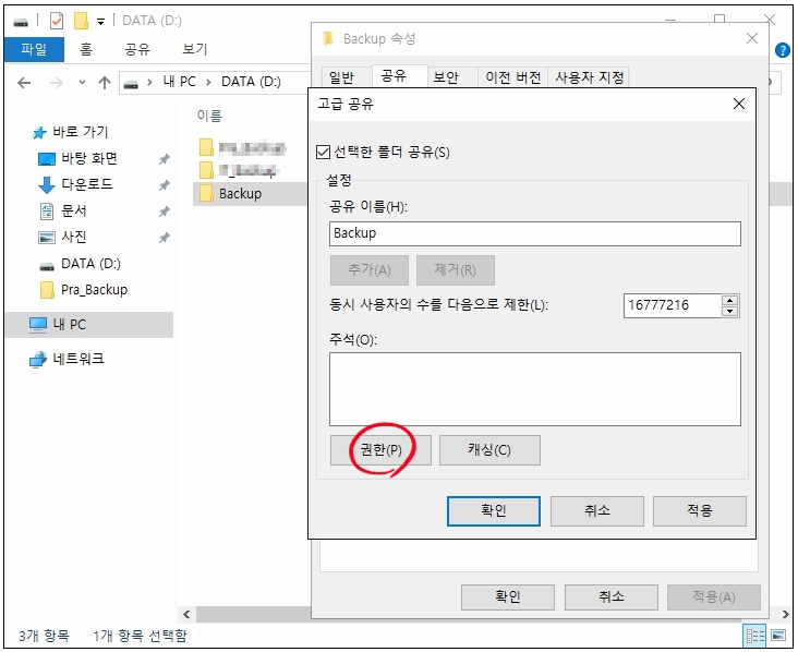 1. 공유 폴더 오른쪽 마우스 속성 > 공유탭 > 고급 공유