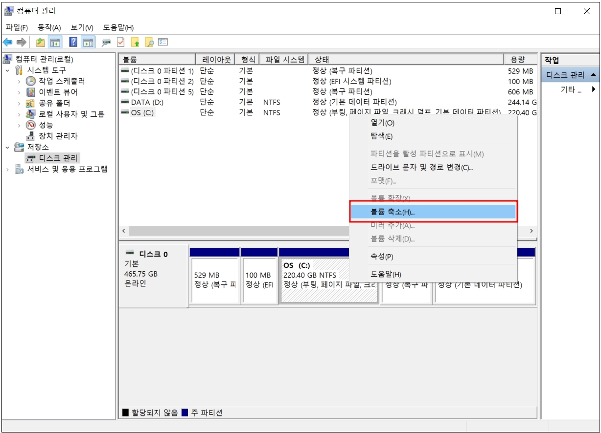 첫 번째, C드라이브 볼륨 축소