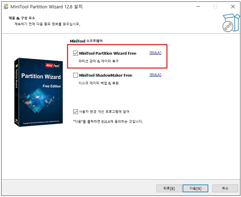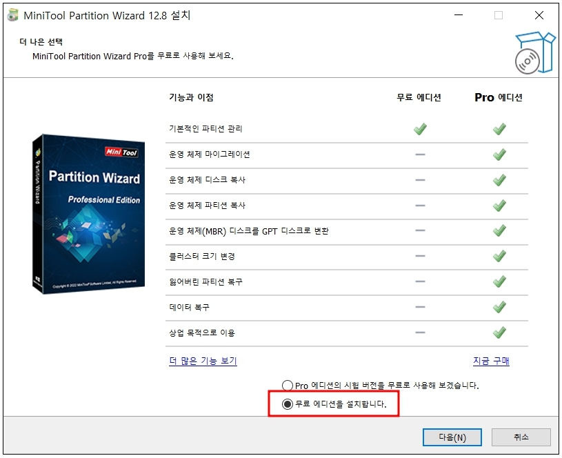 무료 에디션으로 설치하며 MiniTool Partition Wizard Free만 체크하여 설치해 줍니다.