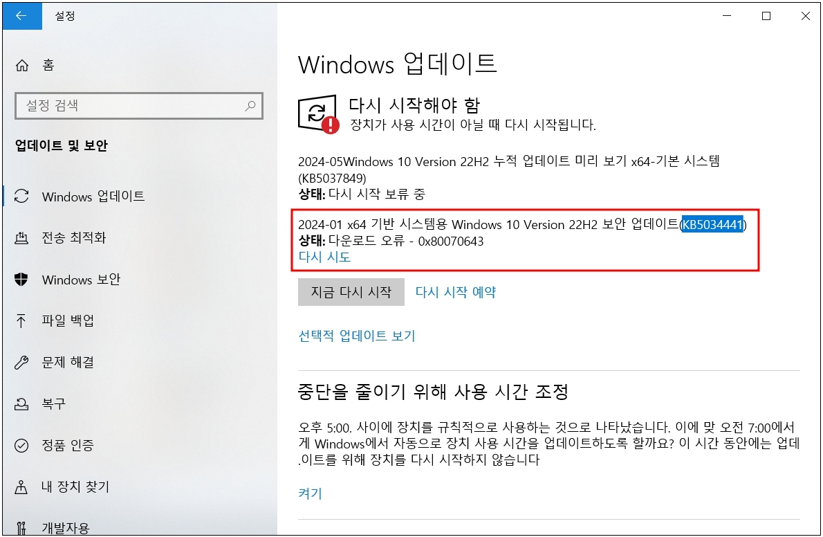 2. 윈도우10 보안 업데이트 오류 해결방법