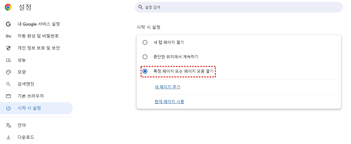 "특정 페이지 또는 페이지 그룹 열기" 옵션을 선택합니다. 이 옵션을 통해 크롬을 실행할 때 열릴 웹사이트 URL을 직접 입력하거나 여러 페이지를 설정할 수 있습니다. 예를 들어, 자주 방문하는 뉴스 사이트, 이메일 서비스, 작업 관리 도구 등을 동시에 열리도록 설정할 수 있습니다.