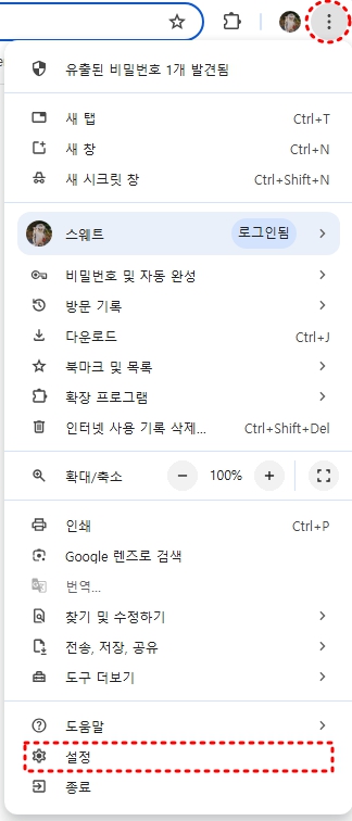2. 우측 상단의 점세개 아이콘을 클릭 > 설정 선택