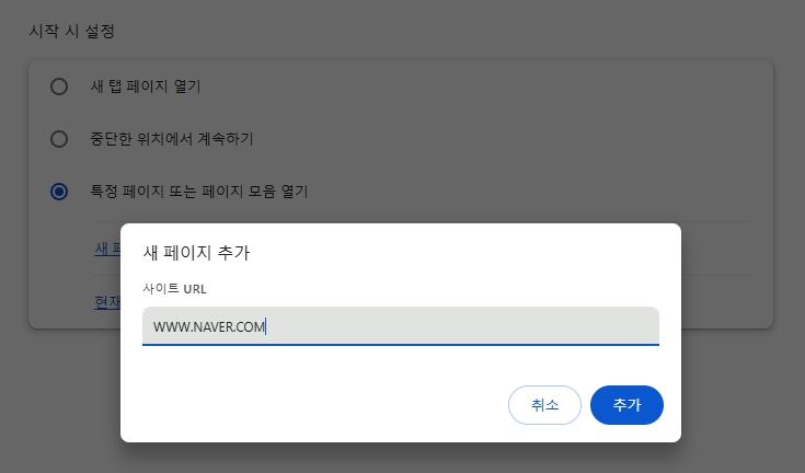 4. 새 페이지 추가 선택 후 시작페이지 설정할 주소 입력 후 추가