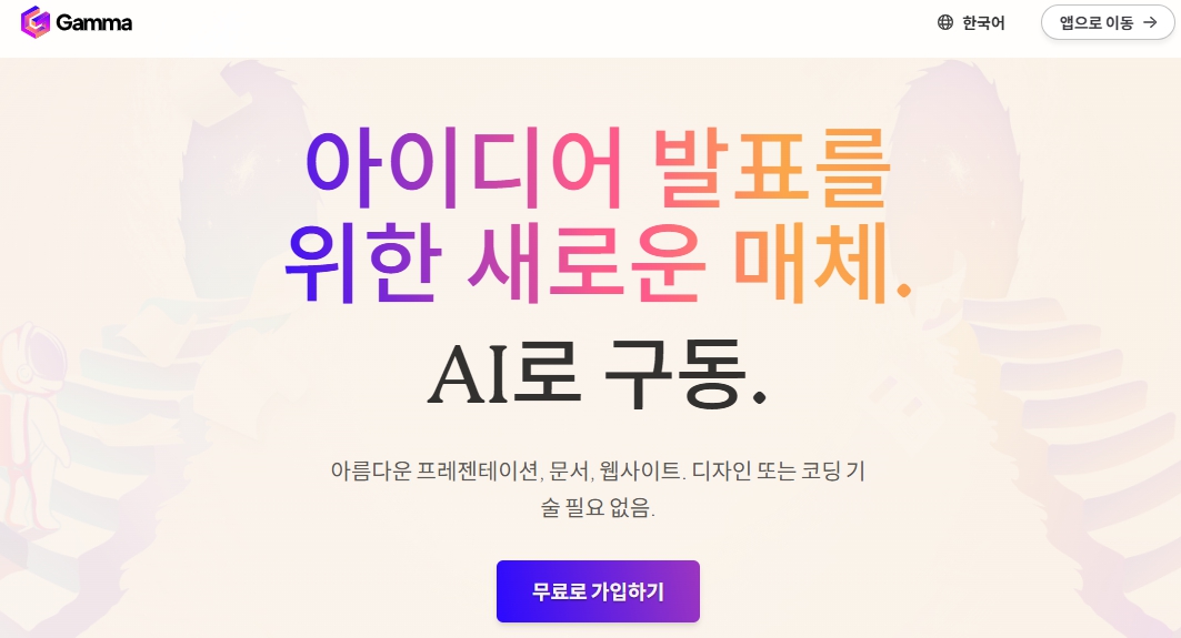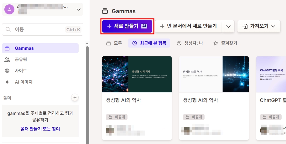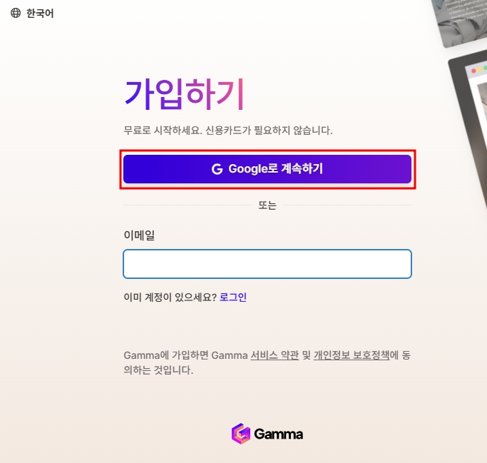 1. 감마AI 홈페이지 접속 후 Google 계정으로 가입하기 > 새로 만들기