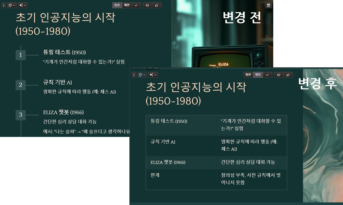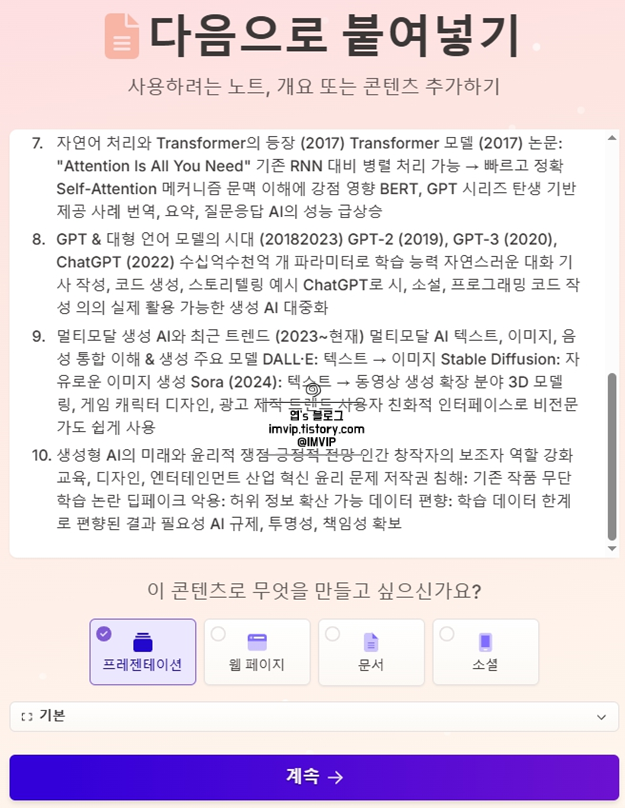 | 1 | 텍스트로 붙여넣기 | 사용자가 직접 작성한 텍스트를 붙여넣어 AI가 슬라이드 형태로 구성 | - 구체적인 내용을 미리 준비한 경우 적합 - 구조와 키워드 중심으로 자동 요약 구성 |