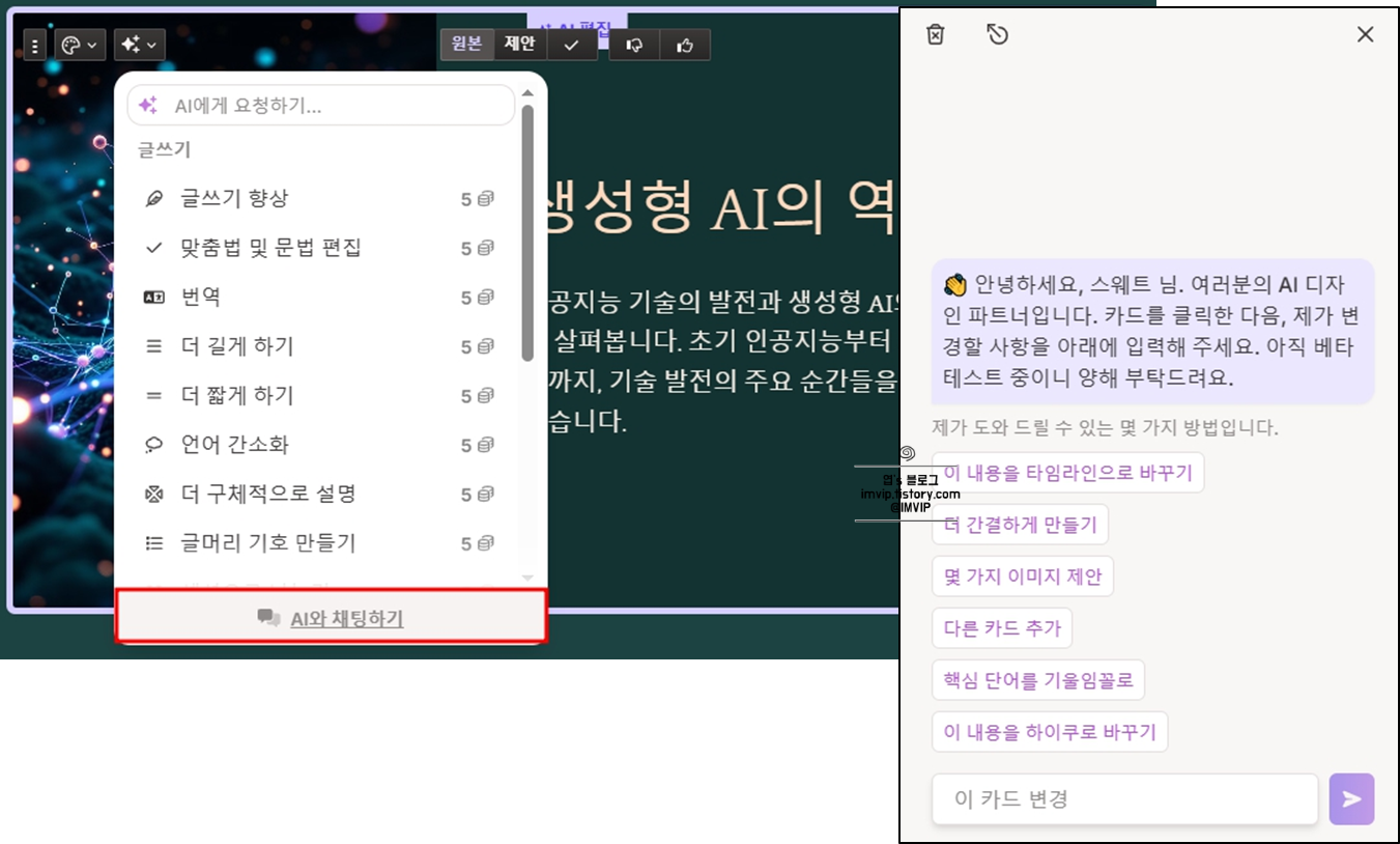 간단한 키워드나 문장을 입력하면 AI가 콘텐츠 전체를 생성 | - 아이디어 스케치나 처음 기획 단계에서 유용 - 빠른 브레인스토밍 가능 - 구조 제안 포함 |