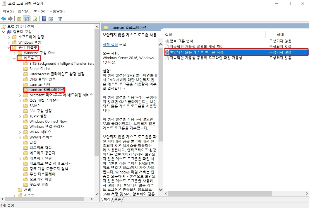 3.컴퓨터 구성 > 관리 템플릿 > 네트워크 > Lanman 워크스테이션 > 보안되지 않은 게스트 로그온 사용 → "사용"으로 변경