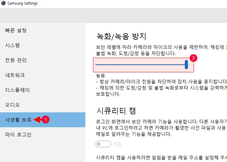 구형 삼성 노트북은 윈도우가 아니라 삼성 전용 보안 프로그램에서 카메라를 막는 경우가 있어서, 이 부분을 꼭 확인해야 합니다.