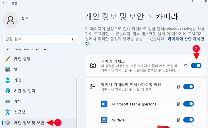 윈도우에서 카메라 접근 권한이 꺼져 있으면, 장치는 정상이어도 카메라 앱에서 “카메라를 찾을 수 없음” 오류가 발생할 수 있습니다.
