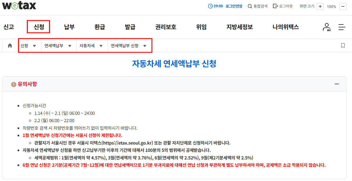 - 신청 > 연세액납부 > 자동차세 > 연세액납부 신청
