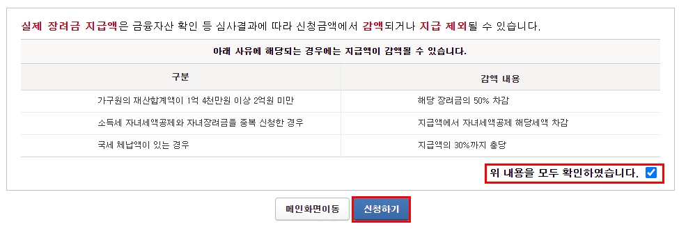 6.내용 확인 후 [위 내용을 모두 확인하였습니다.] 체크 후 신청하기 버튼 클릭